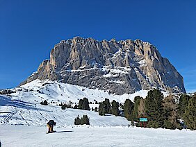 Am nächsten Morgen nach dem Frühstück ging es hinauf ins Grödnertal und auf den Busparkplatz in St Christina an der Saslong-Bahn. Nachdem die Skipässe gekauft und verteilt waren begaben wir uns auf die Piste. Die Alpensüdseite zeigte sich von Ihrer besten Seite, es gab nur vereinzelte Wolkenschleier, ansonsten Sonnenschein und bestens präparierte Pisten.